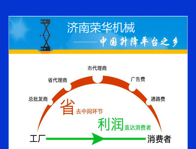 •      濟(jì)南榮華機(jī)械設(shè)備有限公司是一家集研發(fā)、設(shè)計(jì)、和銷售于一體的制造型企業(yè),專業(yè)制造升降平臺(tái)、液壓升降機(jī)械、鋁合金升降平臺(tái),登車橋等,曲臂式升降機(jī),高空作業(yè)平臺(tái),技術(shù)力量雄厚,工藝先進(jìn)合理,檢測(cè)手段齊全。