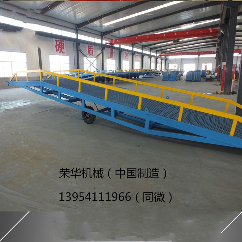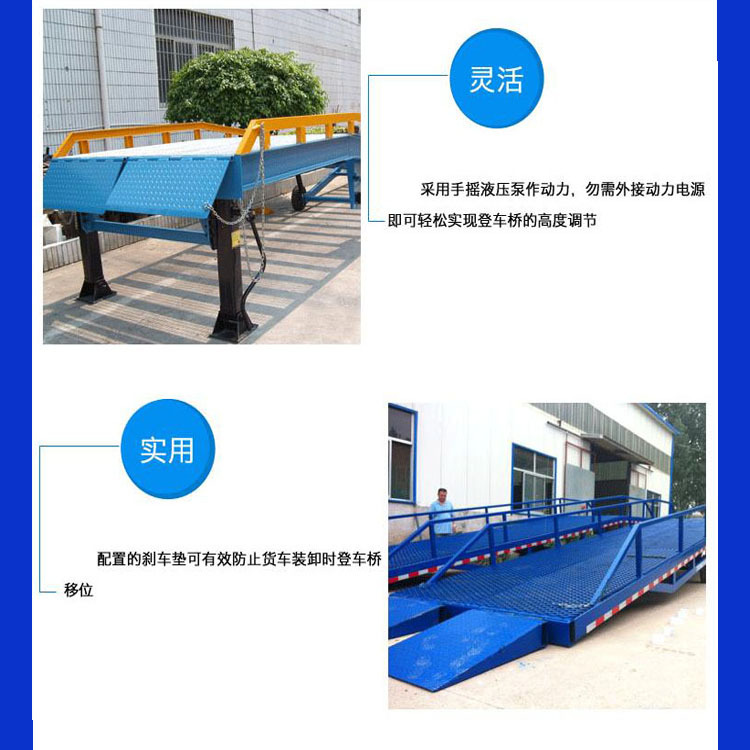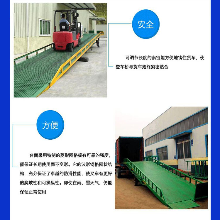 移動(dòng)式登車橋應(yīng)用于無(wú)裝卸站臺(tái)或裝卸位置不固定以及裝卸場(chǎng)地狹小等場(chǎng)合,實(shí)現(xiàn)了貨物快速裝卸。通過(guò)它使叉車等搬運(yùn)車輛直接進(jìn)入貨車、集裝箱、列車車廂裝卸貨物,大大的提高了工效。登車橋采用手動(dòng)液壓操縱,無(wú)需其它動(dòng)力,能適用于各種裝卸場(chǎng)合;登車橋采用支腿支撐和網(wǎng)格狀鋼板結(jié)構(gòu),有更可靠的安全性能。